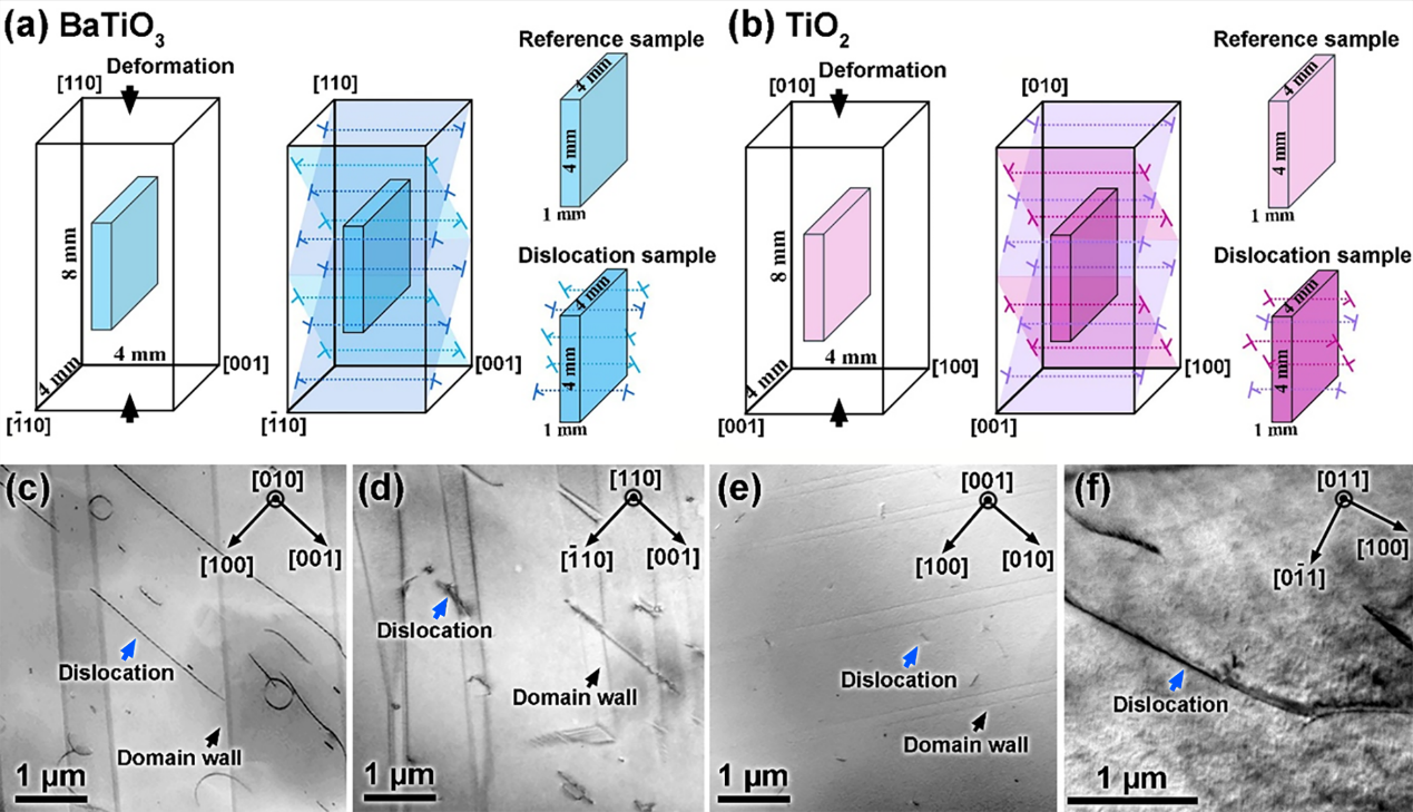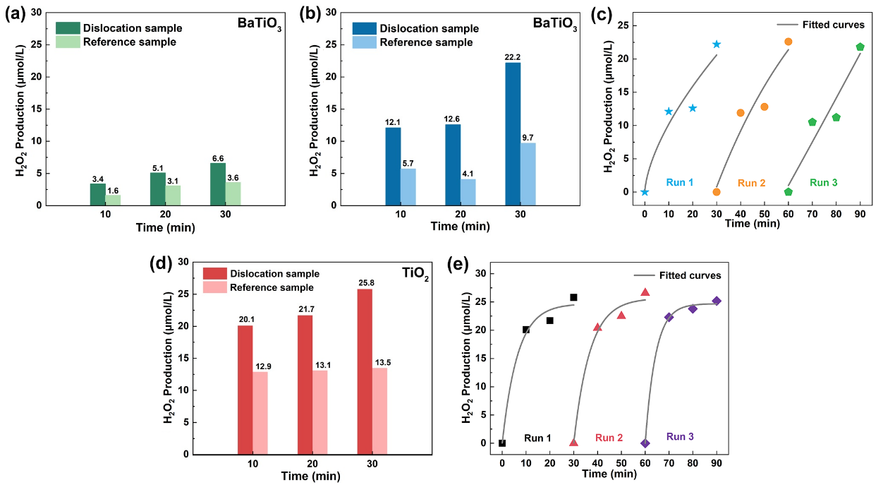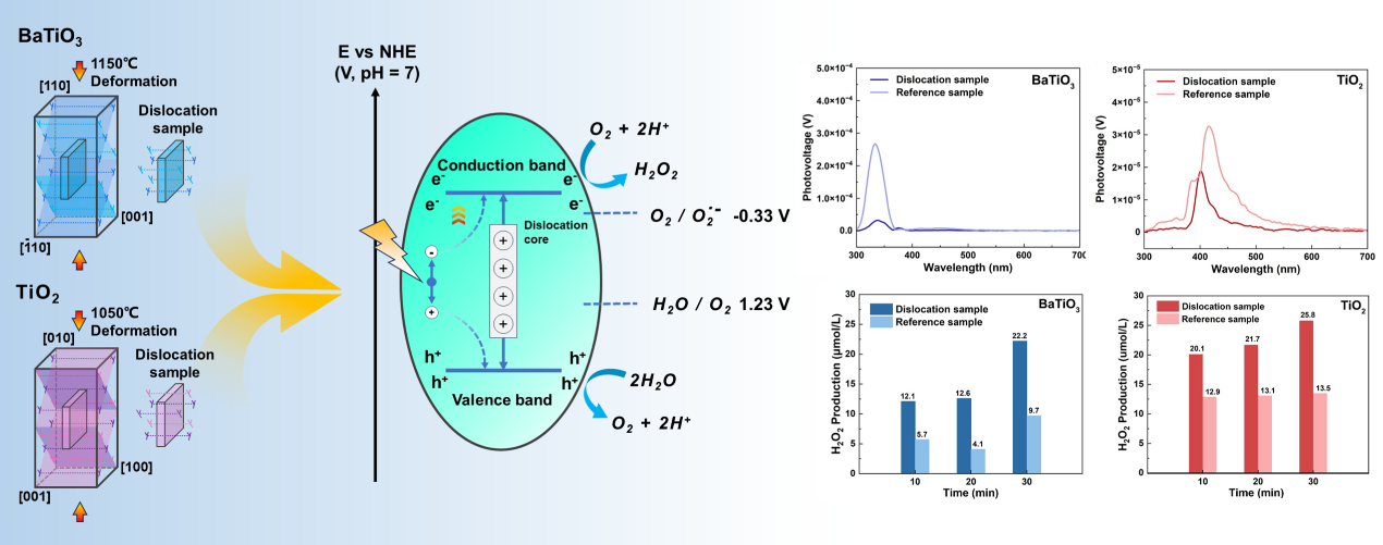 在此次研究中,合作研究团队通过在高温下施加单轴压缩载荷,成功向钛酸钡和二氧化钛块状单晶中引入了主要沿 <001> 和 <100> 取向的位错。实验发现两种金属氧化物的光学性能未明显受到位错的影响。但位错的引入增强了二者的载流子分离/转移能力,有效地抑制了光生电子-空穴对的复合。位错作为光生电子从光催化剂内部到表面迁移的快速通道,本质上提高了光催化剂表面上的光生电子的数量,从而加强了电子主导的光催化反应。因此,这些富含位错的钛酸钡和二氧化钛单晶样品比没有位错的样品具有更强的光催化过氧化氢合成能力。尽管没有牺牲剂的加入,二者的过氧化氢的产率甚至超过了已报道的研究中的多种方法。该研究为调控光催化剂中一维缺陷来促进光催化反应的相关研究开辟了新的途径,使位错工程成为一种颇具希望的可持续调控手段。
