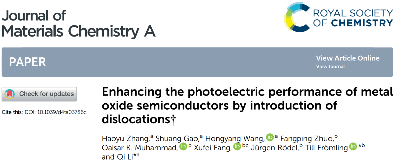 为此,李琦教授团队和德国达姆施塔特工业大学Jürgen Rödel教授团队展开了合作。合作研究团队在本工作中以两种块状金属氧化物单晶为研究对象,通过引入特定取向的位错来探索线缺陷对金属氧化物光催化性能的影响及其作用机理。研究发现通过高温变形引入的位错可以作为光生电子迁移的快速通道,从而提高了光催化剂表面上的光生电子的数量,这有利于电子主导的光催化反应。以光催化过氧化氢合成为基准反应,在无额外牺牲剂帮助的情况下,具有高位错密度的单晶金属氧化物相对于无位错样品实现了光催化过氧化氢合成产量的显著提高。目前相关研究以“Enhancing the photoelectric performance of metaloxide semiconductors by introduction of dislocations” 为题在线发表于国际期刊《Journal of Material Chemistry A》上。我院2022级博士研究生张皓宇为本文第一作者,李琦教授和达姆施塔特工业大学Till Frömling教授为共同通讯作者。