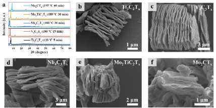 LTMS刻蚀方法具有设备要求低、普适性好、可扩展性强等优点,反应可在高压反应釜、双颈烧瓶、三颈烧瓶等多种容器中进行。除Ti3C2Tx外,通过LTMS策略成功实现了V4C3Tx、Nb4C3Tx、Mo2TiC2Tx、Mo2CTx等MXene的分钟级超快制备。在简单的5000 mL三口烧瓶中单次反应可成功合成超过100克产物,产物具有极高的纯度与均匀的手风琴形貌。本工作为MXene的超快和可扩展合成提供了新途径,有望推动其工业化大规模生产与商业化应用。