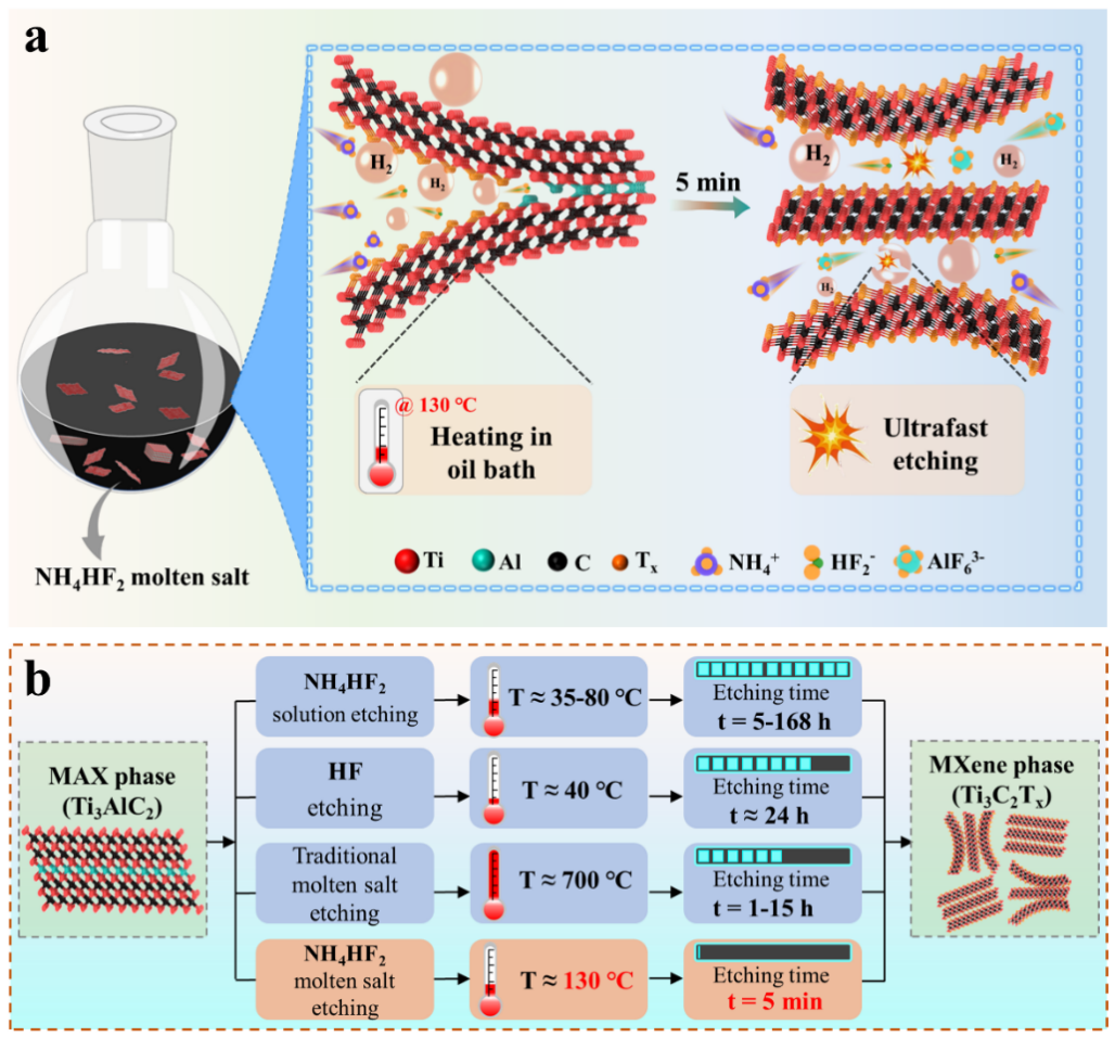 MXene作为目前最具发展前景的二维材料之一,其因独特的物理化学性质在当今新能源、柔性电子、智能传感、生物医疗等多个新技术领域中展现出巨大的应用潜力,成为国家战略需求中的一项关键材料。然而,目前MXene的制备普遍采用传统的氢氟酸溶液或高温熔融盐刻蚀等策略,这些方法通常需要数十到数百小时,且制备条件苛刻、效率低、可扩展性差。这些问题严重阻碍了MXene的大规模生产和实际应用的广泛推广。因此,如何突破这一制备瓶颈,实现MXene高效率、低成本的绿色大规模制备,已成为推动其工业化生产和商业化应用的关键问题。