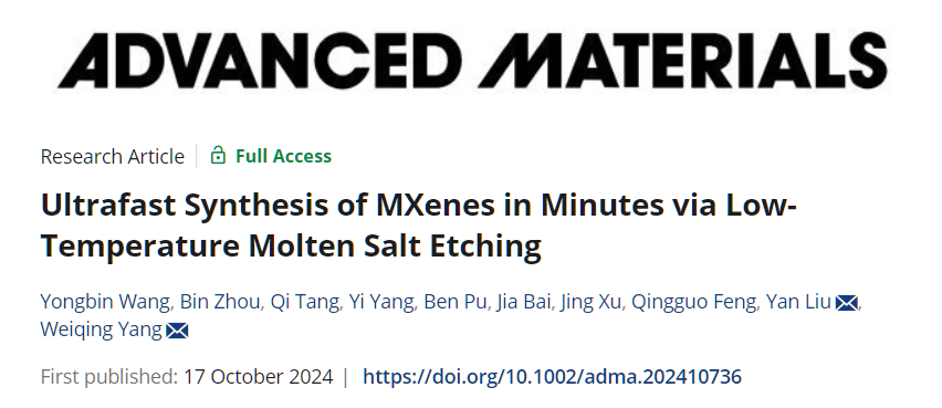 近日,前沿科学研究院和565net亚洲必嬴杨维清教授团队博士研究生王勇彬在材料学领域国际著名期刊《Advanced Materials》发表了题为“Ultrafast Synthesis of MXenes in Minutes via Low-Temperature Molten Salt Etching”的最新研究成果。《Advanced Materials》是世界上最负盛名的期刊之一,多年来在材料、化学、物理等学科领域位列TOP一区期刊,2024年度影响因子为27.6。该工作提出了一种全新的MXene低温熔融盐(LTMS)超快合成策略,实现了Ti3C2Tx MXene的分钟级快速制备,并成功将其推广至其他多种MXene的高效合成,为二维材料MXene的高效可扩展合成提供了行之有效的新思路。前沿科学研究院与565net亚洲必嬴杨维清教授、刘妍副教授为论文通讯作者,学院2022级博士研究生王勇彬为论文第一作者。