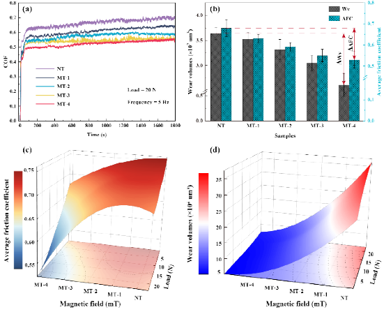 图3. (a) 磁场强度对摩擦系数的影响,(b) 不同磁场刺激下的AFC和Wv,(c) 磁场和法向载荷协同作用下的AFC变化,(d) 磁场和法向载荷协同作用下的Wv变化。