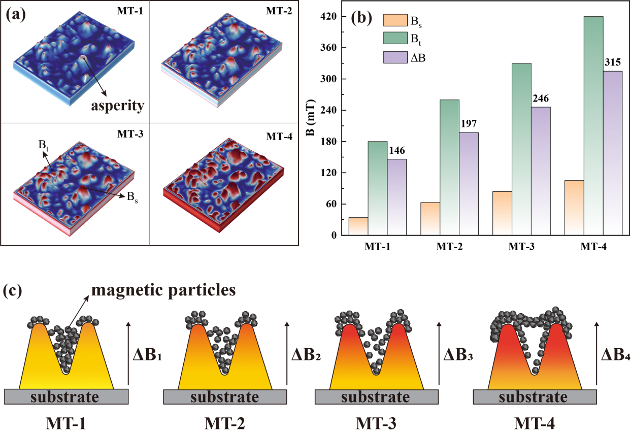 首先,作者展示了磁场对磨损表面磁性颗粒分布及摩擦膜形成的影响。图2(a)为在不同强度的磁场刺激下,磨损表面磁感应强度的分布情况,随着磁场强度的增加,表面凸起处的磁感应强度(Bt)明显增强,而基体表面(Bs)则保持较为均匀。图2(b)量化了不同磁场条件下的磁场梯度(ΔB),并表明磁场强度越高,ΔB越大,尤其是表面粗糙度增加时,磁场梯度更为显著。图2(c)则展示了在不同磁场梯度下,磨损颗粒聚集在表面凸起处的情况。随着磁场梯度的增强,颗粒在凸起尖端的聚集变得更加明显,形成链状结构,最终颗粒在反复摩擦中填充磨损轨迹,形成致密的摩擦膜,有效隔离摩擦对基体的磨损。