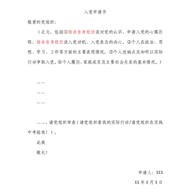 入党申请书是入党申请人慎重思考后向党组织提出的自己的政治选择的形式。入党申请书的基本书写格式及内容通常如下: