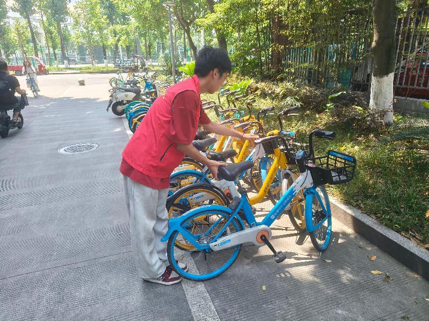 活动中,党员志愿者率先垂范,分赴校内交通路口与共享单车集中停放区。在上下课高峰时段,党员骨干手持文明通行标语喇叭、口哨指令与荧光棒引导车流人流,对横穿马路、闯红灯等行为及时劝阻;在单车停放区,党员带头推行“一摆二劝三宣传”工作法——规范摆放违规车辆、劝导师生文明停车、循环播放停车提示语音,带动非党员志愿者共同将200余辆共享单车归整至指定区域。“作为党员,我们既要做文明秩序的维护者,更要做校园文明的播种者。”参与活动的学生党员表示。